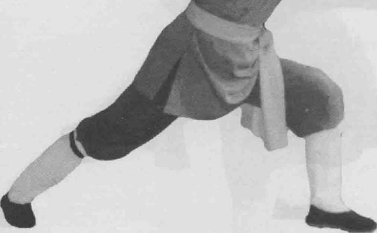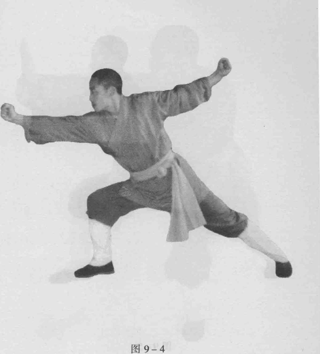 向右前方落右脚,呈右弓步,两拳随身势展于左右两 侧。拳心向前,拳眼向上,呈弓步单鞭式,目视右前方。 (见图9-4)