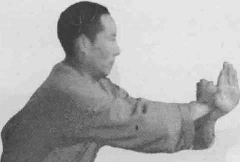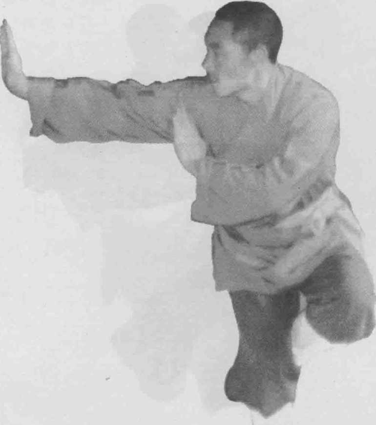 猛向后转180度,右弓步变为左弓步。同时左拳变立 掌,向前猛推,右拳随左掌冲至左手碗处,拳眼向内上方, 目视左前方。(见图9-5)