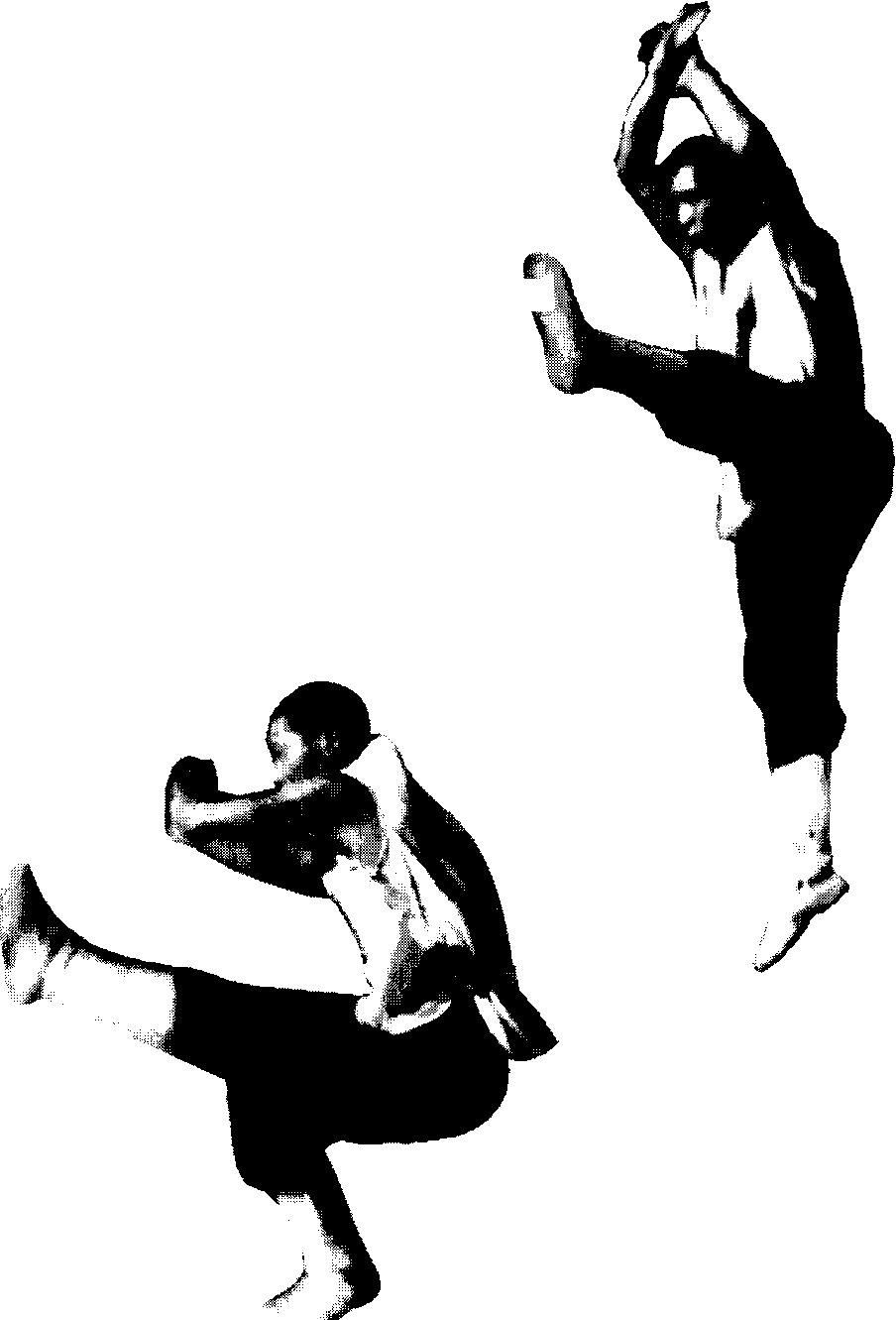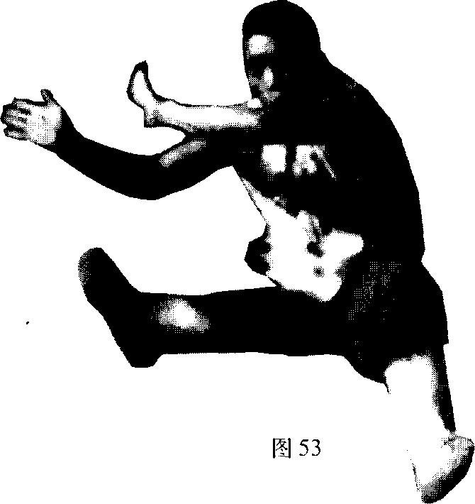 右脚蹬地跳起,同时左腿向右 上方里合踢摆,两手于头上击响, 上体向左旋转,身体腾空(图51)。 右腿外摆,两手先左后右拍击右脚 面,左腿屈膝收控于右腿侧;上体 微前倾,两眼随视两手(图52)。双U 手空中击响时,左腿可伸直分开摆 动,控于体侧。(图53)