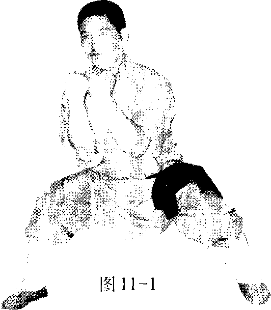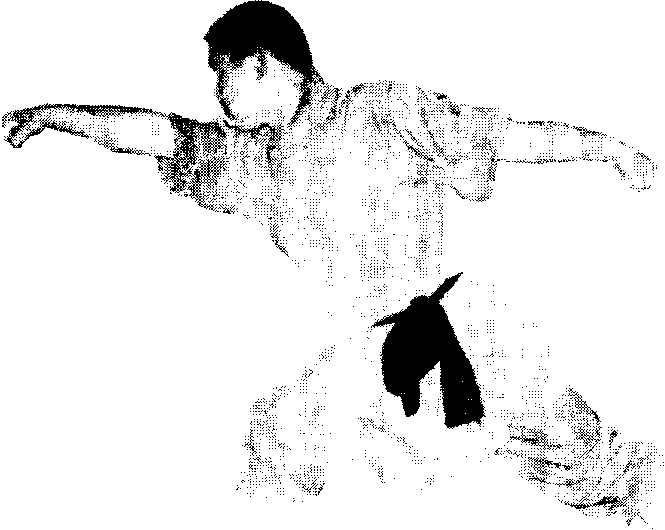 右脚直接跳起二起脚, 左拳收于腰间,右拳向下至 腰间,变抢手向前击出,手 脚在空中击响G (见图9) 十' 罗汉端灯右脚在瓠方落地,左脚 提膝护裆。左拳向下向后摆 至后方。右掌变拳从腰间向 下向前上挑击,成端灯势, 一动一静,六合成势。(见图 10)图 11~2图 11~2图 11~2图 11~2