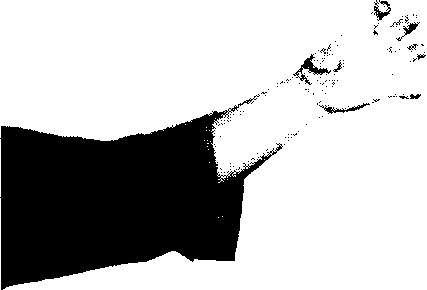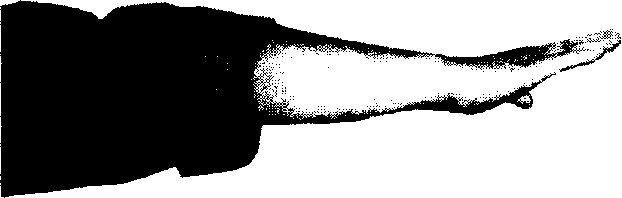 手掌向前 伸直,四指并 拢,指尖向前, 拇指内扣状如 柳叶,力量用于 掌锋。此图为横 切向。(左右同) (图8)