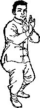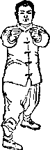 双掌向前下方一抄成十字交叉形向前一崩双掌再在左右两旁各打一花。向胸前揉起左掌在后右掌在前十指向上掌根朝外同时左脚落实。右脚向前进一步成寒鸡势。面朝南(图37)。