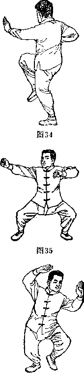 右脚向右前斜方落步成马裆势。左掌变拳曲肘平肩拳心向下。右拳同时向右平方冲出。眼视右方。正面朝西(图35)。