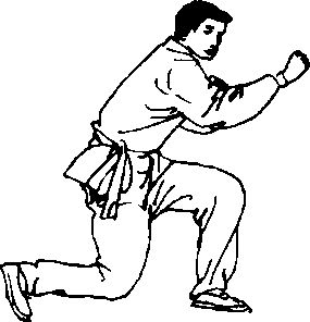 两腿错步站立,两脚间距约为本人的两脚掌长,前腿屈膝 下蹲,脚尖微内扣,大小腿之间的夹角约为90。。后腿跪下接 近地面,但不得触地,小腿接近水平,上体微前倾,目视前方。 (图 96)