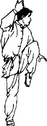 一腿支撑,另一腿屈膝提起,合膝护裆,可配合各种手型。 在实战中主要用于提膝,闪开对方的进攻和反击。要求提闪 快,站得稳,立腰收胯,托气,提膝的高度要根据对方进攻的高 低而定。(图97)