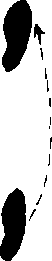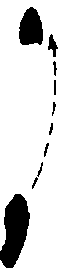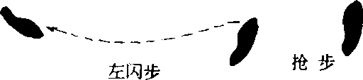 格斗势站立,突然向侧方移步,急避敌手进攻。以移动方 向的不同,分为左闪步、右闪步。左闪步是左脚先向左横跨一' 步,右脚随之向左横移;右闪步相反。足迹路线见(图100) o