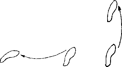 格斗势站立,一脚突然擦地移动,另一脚快速擦地跟步, 仍成原站立姿势。向前移动为前滑步,向后移动为后滑步,向 侧移动为侧滑步。足迹路线见(图98、99)。