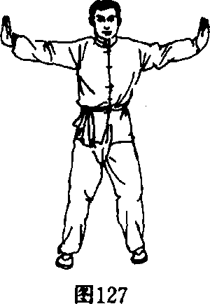 接上势,两掌从上分向两侧成侧平举,塌腕成立掌,掌心 向外,呼吸方法同上势。将丹田之气引达双掌时,用暗劲用力 向左右推出,犹如将左右两座大山推倒之势,同时两脚趾抓 地,牙齿紧咬,目瞪前方(图127)。连续练习49次,然后两臂 下垂成预备势。