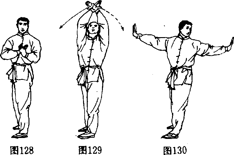 2. 随吸气入丹田,两臂内旋,两掌心翻转向上并上举至 头顶。(图129)