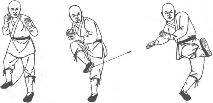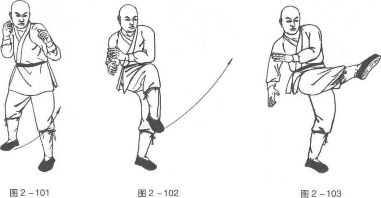 2. 右腿屈膝提起,脚面绷直,大腿面尽量贴近身体,重心移至左腿,同时, 左腿伸直,脚尖外展,身体左转约45度。左臂收向身体,右臂后摆,蓄积力量。 (图 2-102 )