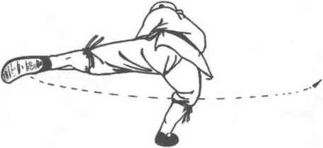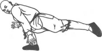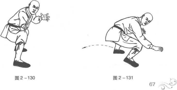 【动作】1. 右开门势站立;再左脚向后滑步,屈膝下蹲,重心尽量降低。两掌十指张 开,两臂护住下颌与腹部。(图2-130)2. 身体前倾,提右脚跟。(图2-131)3. 以右脚为轴,左脚绷脚、伸直,由后扫向身体左侧。两臂向前伸开,目视 左腿而动。(图2-132)图 2 -1324. 动作不停,左腿平扫180度。(图2-133)图 2—133【要点】右脚用力蹬地,重心后移,迅速抬左脚扫击。
