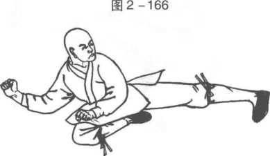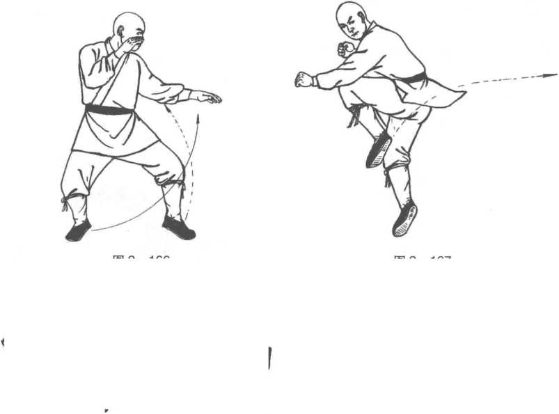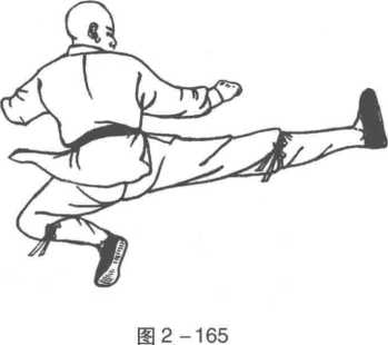 【动作】1. 左开门势站立。(图2-166)2. 右脚向前、向上、向左画弧摆腿,左脚蹬地向上跃起,身体向上提,并向左转体。(图2-167)图 2-1673.在空中,左腿先屈腿贴靠于左胸 前,待身体腾跃以背对敌时,再挺膝直 腿,脚尖向下勾紧,以脚跟向后、向左 后方蹬击。同时,右腿上跃屈膝,上体 略向下倾,腿高与腰平齐。(图2-168)图 2-168【要点】起跃要高,转体灵活、快速、旋劲,边转边踢。挺胸收腹,送髓挺膝,直腿勾 足,力达脚跟。