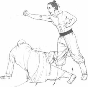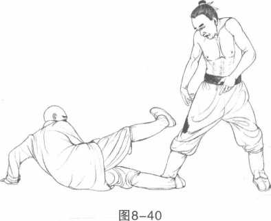 【实战举例】1.敌右进步,迎面一拳击来。我方欲不及,左旋身侧倒, 两手按地面,避过敌拳,同时,以左脚背顺跌势将敌右脚后跟勾 住,向我勾拉。(图8-39)2.动作不停,我右脚配合左脚勾拉之劲,施冷劲,照准敌 右膝蹬击,则敌腿必断。(图8-40)[技击要点]此法乃乘敌一拳击来时,闪而断其腿。38-4138-4138-4138-41