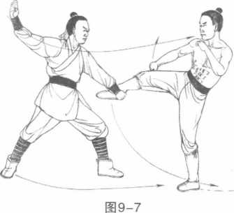 1.敌右腿鞭踢我左腰。我左手反挂其左脚踝关节后侧,体 略左旋,化解其鞭踢之力。(图9-7)