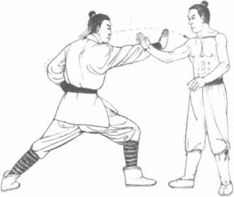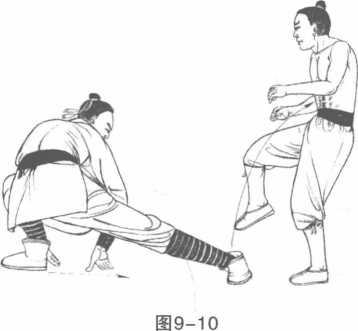 1.我两手向敌前上作一虚晃,迅疾沉身,右腿擦地扫敌右 脚跟。敌提膝避过我扫腿。(图9-10)