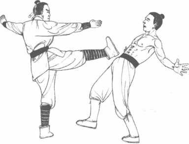 2.我起身,左脚 垫步,右腿发力,用 脚跟蹬踢敌腹部,将 其重创。(图9-11 )