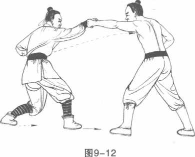 [实战举例】1.敌左脚进步,左拳击我胸部。我左脚撤退一步,右手上 划,接住敌左腕内侧。(图9-12 )2.前滑步,左掌推击 敌心口,将其重创。(图 9-13 )