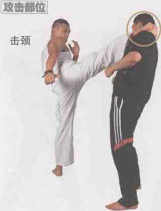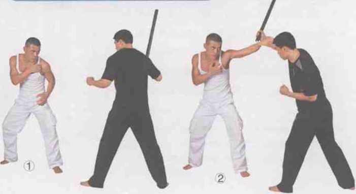 准备式站立。s左脚向前稍稍滑步直立或稍屈支撑,脚 尖外展,身体左旋转体180。,收腹合骸。同时 右腿屈膝上提,大腿面平行地面,小腿指向右 侧。两拳护住下颌。【?阐脸】右脚绷直.勾脚向前往左再向下呈弧 线勾踢,脚背屈紧并内扣,力达脚弓内侧。要领b滑步转身要快,挂的动作修度不 宜过大,要借势发力。同时,注意发 力时足跟要擦地出击,力点准碗I,保 持身体平稳,—z-沙称十二!中谭腿511对方持短棍,双方对峙中。2对方右手持短棍向下劈击我头部,左前 臂格架住对方右手腕。3同时右腿屈膝上提,小腿向右后4接着右腿绷直,横向劈击对方颈部。