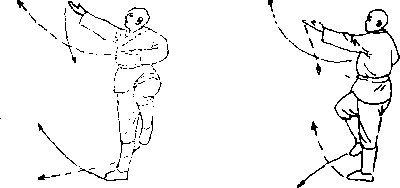 右脚在前方半步落地,抬左腿 两拳变掌,右掌向前方 平穿,掌心它上,掌指向前左掌屈肘平端于左肋前侧,掌 心向上,掌指向前,目视右掌(图77)。功作不停,左脚在 右脚前一步落地,抬右腿左掌向前穿击,掌心向上,掌指 向前。右掌屈肘平端于右肋前侧,掌心向上,掌指向前目 视左掌(图78). ?