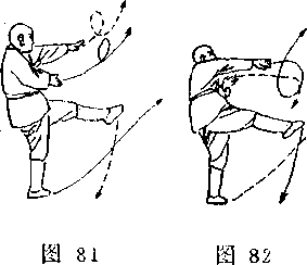 右脚向前半步,抬左脚向前方弹踢两拳变掌,向上向 右旋腕划孤向下再向左屈肘拨打,两掌心向左,掌指創向 方视左脚(图1).动作不停,左脚在右前方一步 地,抬右脚向前弹踢,两掌由左向右向上旋腕划弧再向右屈 肘拨打,掌心全向右,掌指都向斜前方 视右辟(图82) 动作不停,右脚在左脚前一步落地,速抬左脚间前踢两 掌变拳,右拳向上横架头上前方,拳心向外,左拳护」右肋 前侧,拳手向下目视左脚(图83) ?