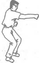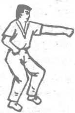 2 .两腿成马步,双拳抱于腰间,右拳向前直臂冲击,拳 心向左,左拳仍抱腰间不动I拳心向上,目视右拳(图12).