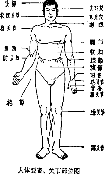 了解人体要害部位和主要关节的目的,是为了在向敌人 使用擒拿、解脱或反击时,准确地击其要害,控制关节,制 服敌人,或化解敌人的控制,并打击敌人5保护自己。