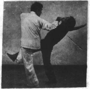 速以右踹腿猛击敌之侧肋或膝关节部位。力达脚外缘,将敌击伤倒地(图4-4-203-?).