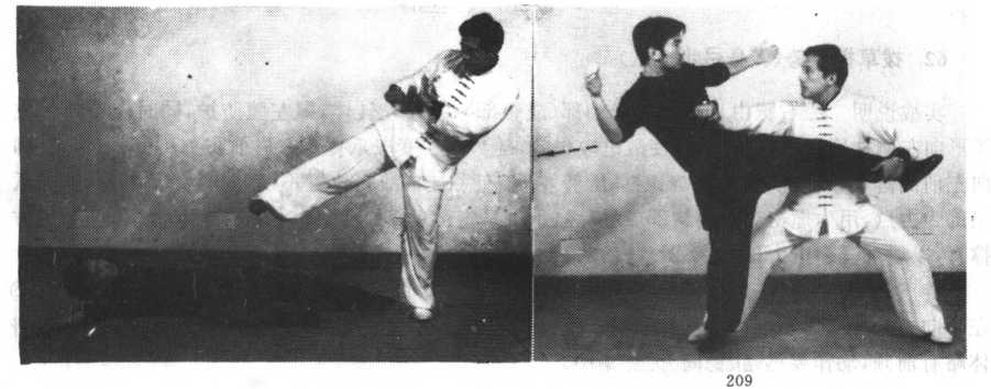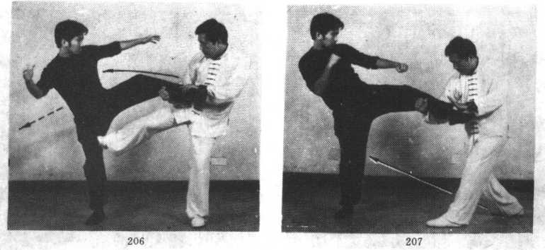 (2)敌左腿踢我裆部,我速以右拳臂抄抱敌左腿(小腿或脚踝部),同时左掌顺势配合控制 (敌脚踝部),使其不易逃脱。随势突发右侧踹腿,用力踹击对方支撑腿内侧(膝关节)以上,将其踹 倒。如上述动作失误,应速落右腿,置于敌支撑脚后侧(防敌逃脱),左手控制不动,右拳以拳轮为 力点,同时向右横扫,猛击敌之腹腔、侧肋,将其击倒(图4-4-206—209)0