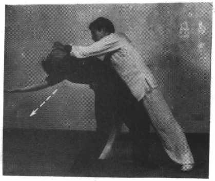 实战说明敌在拳击头部,我速上左步,以右拳向上撩架敌拳。随势右脚上步近身,置于敌腿 后侧(避其逃脱),右掌同时向右、向下按压敌臂,并顺势抱搂敌腰部,随之左手由腰间变虎爪,向 前猛力撞推敌之下颁(五指端可同时抠抓敌面、目),力达掌根使敌后仰倒地(图4-4-210,211)0