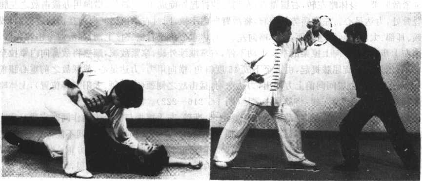 实战说明敌左拳击我头部,我速侧身左弓步,以后手虎爪币撩架放之拳臂。上动不停,右手 外旋腕,抓拿敌腕后用>7外旋,并同时上左步、上右步,屈肘将敌拳腕顺势牵拉至腹前,同时左手 猛力撞推敌之咽候,办达“虎口 ”,将敌拧摔倒地,左膝关节迅速顶压敌之腹腔,如217附图。敌左 拳击我头部,我速左上步以左掌向上撩架敌拳腕。上动不停,右脚上步成右弓步姿势,左掌顺势外 旋拿紧敌腕部。身体略左转,右腿蹬直,左脚屈膝提起外旋成45度斜角,横向用办截击敌之左腿 前胫骨处,力达足心。左掌顺势外旋腕,将敌臂向内牵拉,同时右拳由腰间向前猛击敌之侧颈(或 下颁、耳部、太阳穴),力达拳面,上体略向左斜,身体重心落至右腿。接上动,如敌右拳击我头部, 我速左上步,出右掌向上撩架敌拳。上动不停,右掌继续外旋,拿紧敌腕,顺热将敌臂向内牵拉至 腹前,右腿同时外旋屈膝提起,由上至下成45度斜角,横向用力,力达足心,截踩敌之前重心腿前 胫骨。左拳同时由腰间向前上方冲出,力达拳而,猛击敌之侧颈(或下颊、太阳穴等位置),上体略 向右斜,身体重心落至左腿,将敌重击倒地(图4-5-216—222)。