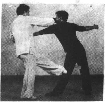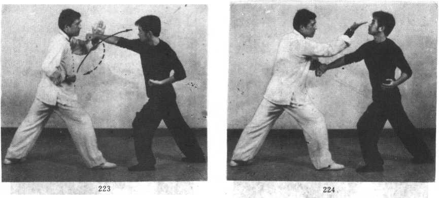 实战说明敌右拳击我头部,我速右上步,以左掌向下拍击敌拳腕,迫其进攻失效。右拳变掌 随势向上戳穿,速击对方眼部(或咽喉),掌心朝上,肘端略下垂,力达指端(图4-5-223,224).