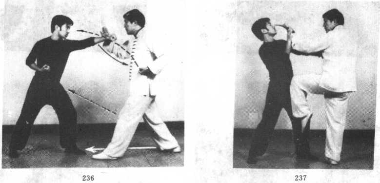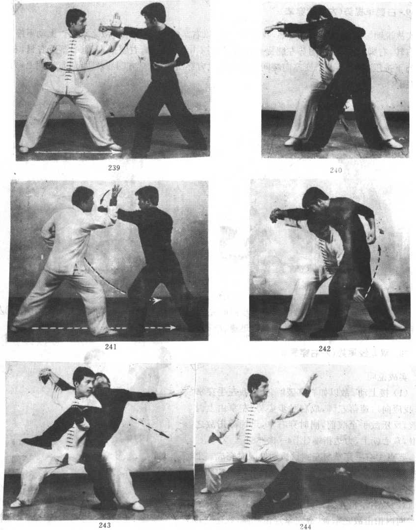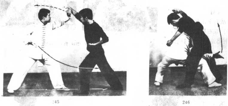 身上右步,成右弓步姿势,随势以右小臂屈肘向内横格敌拳臂,使其进攻失效。上动不停,借化解 敌拳之机,我速右转身,上左步,随势上体前倾,以左掌穿入对方两腿之间。右掌继续内旋下压敌 拳,并顺势拿住敌腕部,经头部向体右侧抻拉,同时以左肩背紧贴敌之腹部。顺势左掌挑起敌之左 腿,将对方向体后掀翻摔倒(图4-5-239—244)。