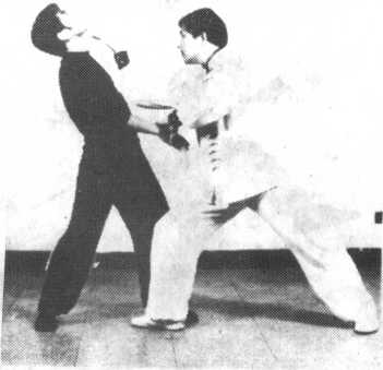 要点:①右掌下压,抓握敌腕与右上步同时完成。上步进身时,将其敌腕向右下侧牵引。②左 上穿掌与左提膝动作同时完成。动作要迅速、准确、力点集中。