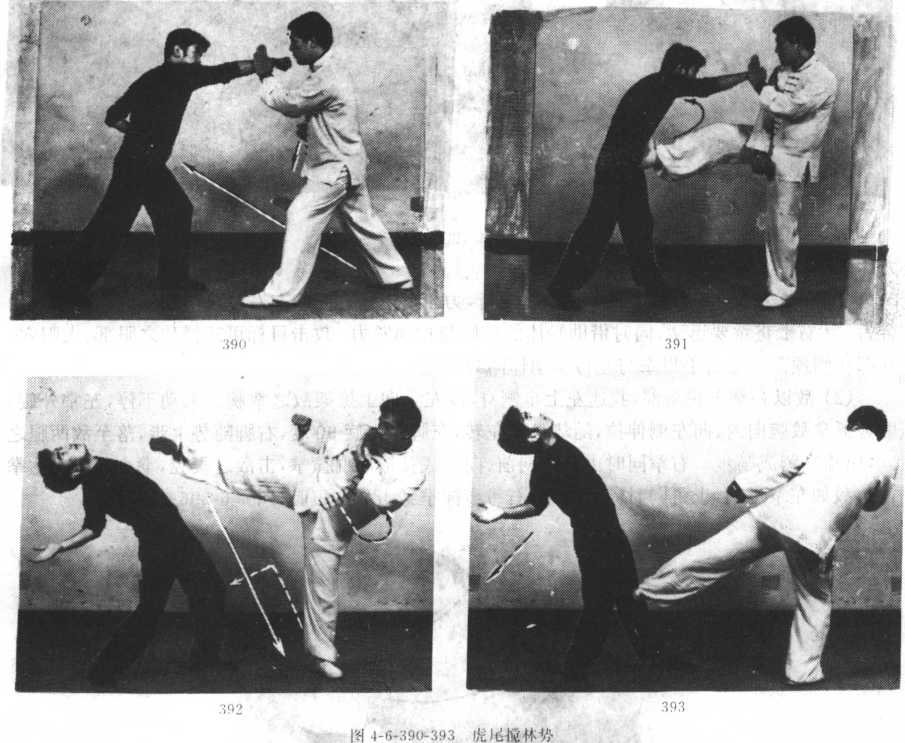 实战说明敌发右拳击我头部,我速左闪身左上步,以左掌由外向内拍击敌之拳腕,使敌拳 击空。上动不停,右腿随势用力蹬击敌之腹腔.力达足跟。右拳同时下栽.臂部紧贴上体,拳心朝 内护住上体用裆部。接上动,右脚速侧身收回后,突发右上踹腿?猛击敌头部,力达脚外缘,将敌击 倒,同时两手相应防护上体。如踹腿力量小,或遇敌躲闪时,应迅速右脚落地(脚尖朝后),随左后 转体,右脚以前脚掌为轴.后脚跟外旋约90度,同时左腿屈膝提起.随后向体左下侧用力挺膝猛 踹.力达脚外比重?重创敌之前胫骨(小腿“迎面骨”)?将敌击倒(图4-6-390-393)。,