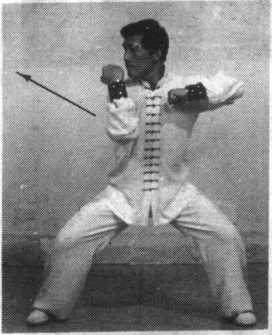实战技法 如敌拳(掌)向我头部袭来.应速以右掌向上格架,并顺势撤住敌『臂向内抻拉. 左掌应速以截掌击敌之肋部(向上可击敌之颈部)。左提膝可护裆,防御敌之攻击;又可配合截掌 顶撞敌之裆部。