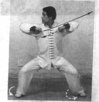 (2) 接上动。左拳不动,右肘端以肩为轴,向右侧用力顶出,高与肩平;拳心朝下,腕部挺直, 置于右肩前,与肩相距约5—10厘米;眼看右侧(图3-5-222)0