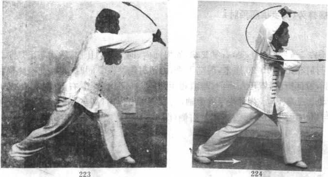 肩前。身体重心落至两腿之间,眼看右掌(图3-5-225),