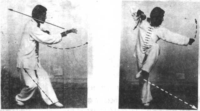 (3) ±动不停。身体微左转,右脚随势向前迈半步.屈膝半蹲。右掌继续由头顶上方外旋向 -右、向下、向前成弧形摆动,置体前高与肩平,学指朝前,掌心朝上,肘部略屈。左掌略内收,'骨于右
