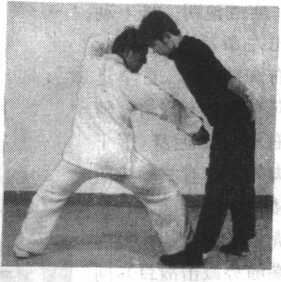 要点:①右掌截击的同时,应顺势向前搂抱敌之腰部,同时向内用力抱紧,与左撞爪动作同时 完成。②撞推敌之下须前,可先以爪端戳击其眼部,利用敌向后躲闪,下颁抬起的一瞬间,掌根突 然发力撞击。③撞击动作时要紧靠敌身,突发用力,将敌击倒,并使其后脑猛力撞击地面。