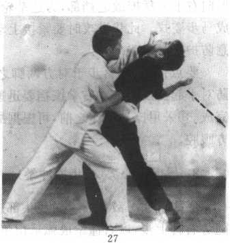 实战说明接上动。实战说明接上动。敌出左拳反击我腹腔, 我右脚略撤步,右掌迅 速向右侧下方截击。随 势右脚上步近身(落于 敌脚外侧),右掌顺势向 前搂抱住敌腰部。右掌' 变虎爪(以掌根为力点, 指端随势戳击敌目),同 时用力撞击其下颁,使 敌向后摔倒(图4-1-26、