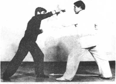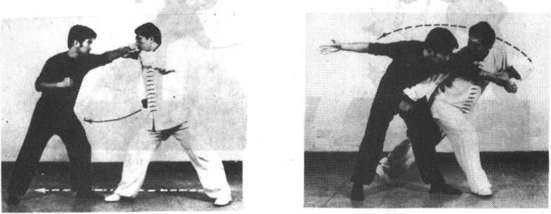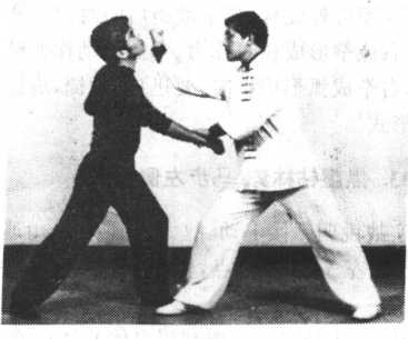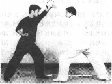 实战说明敌发右拳还击我头部时,我速以左掌向内拍按敌拳腕至腹前。同时右上步近身,