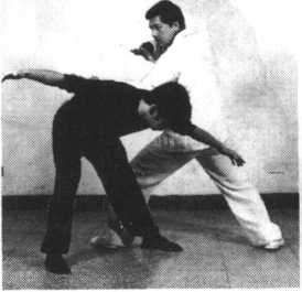 实战说明接上动。敌如后退躲闪,可速左 转身,以左拳轮为力点,击敌腰肾部(图4-2- 105)。