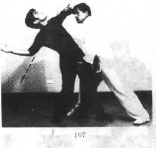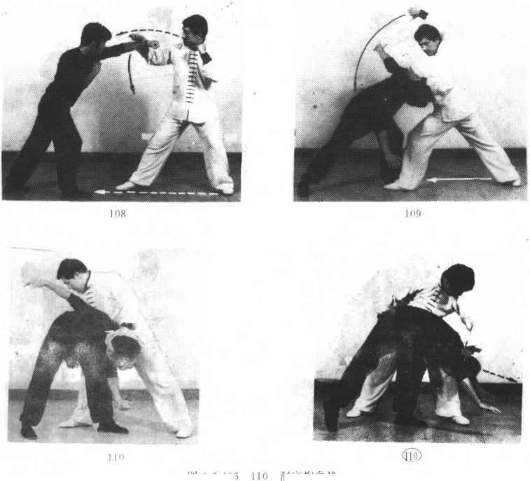 实战说明敌以左上勾拳击我腹腔,我速以右手虎爪向体右侧挂压敌尹。同时右脚上半步近 身,顺势将其敌左拳向右上方撩起,左手虎爪乘势用力提抓敌之裆部,将其用力提翻、摔倒。如敌 进攻(左直拳击头部),可迅速用右手虎爪将其向下挂压的同时,左手顺势向工下抽拳,击敌之头 颈部,并顺势按压敌之后脑。同时借用敌弯腰躲闪前倾的瞬间,速上右步.以右手虎爪从敌背后裆 下插入,用力抓、提其裆部,将其倒提起来摔倒(图4-2-106 110)。