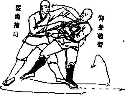 里右脚下落抬左脚上前一步出两手推乙名为虎推山工乙上身后仰躲招同时右拳由下向上磕击中右臂,名为仰身磕臂工(图26)