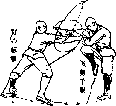 甲上体左转拾右脚上前成右弓步出右拳向前冲击乙胸部名为盯心标拳工乙抬两脚向后倒跳一步抬右腿提膝同时出左手挡击甲右拳又出左手金剪指插甲左眼名为阿飞剪千眼工(图27)