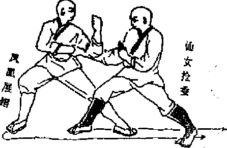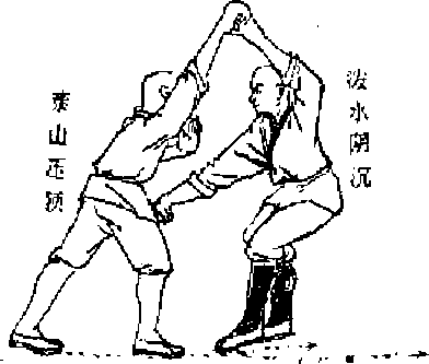 甲抬左脚向左踮跳一步右脚落左脚前成右弓步同时抬右拳下砸乙荚顶名为泰山压顶乙乙右脚下落左脚向前半步成虚步同时出左手向前上方挡住甲右手再速出右拳向前下方撩击甲阴部名为泼水阴沉屋(图2步