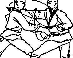 甲体向左转,右脚上前一步出右手向前猛抓乙左手腕向怀内拉名为瞎子牵驴九乙右脚后退一步出右手由外向内斩砍甲颈部名为单手斩剑工(图30)