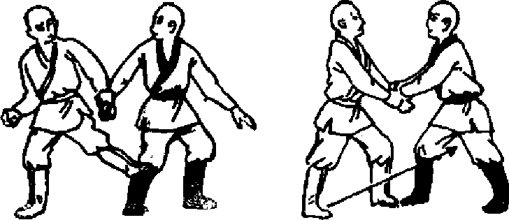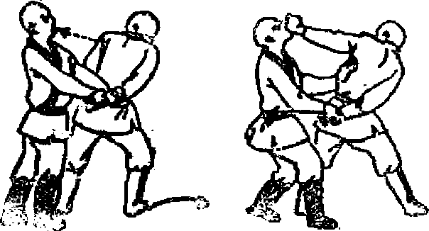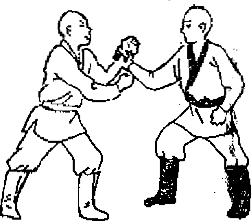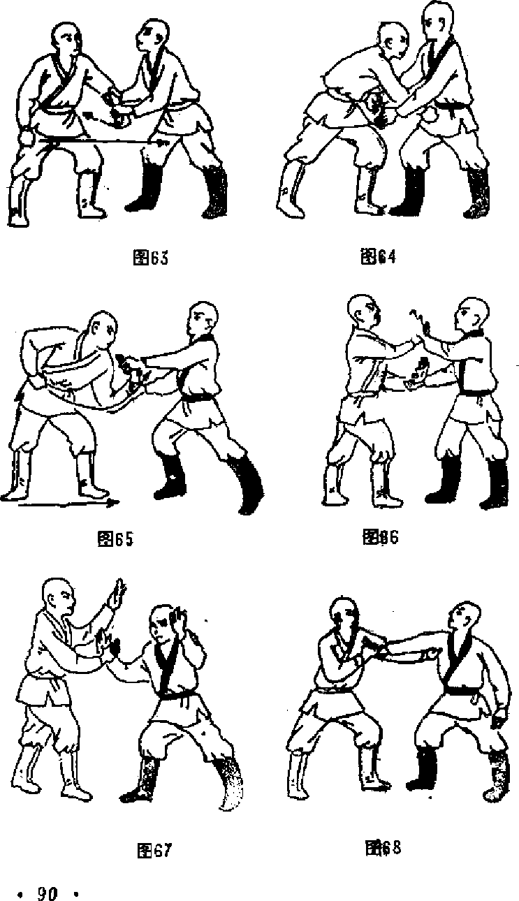 16 屈肘擅裆如甲左手臂被乙双手擒住(图窃力甲可左手握拳屈肘用力从乙的双干中抽出右手顺势向前抓乙裆部或变拳猛击打乙的裆部口(图64)