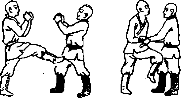 13 低蹦脚如甲左手腕被乙擒住甲可疾出左脚踹乙右膝关节侧弯处或膝瓶窝,(图初)
