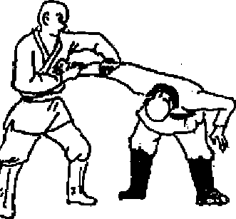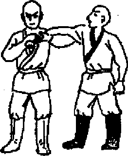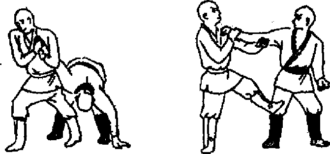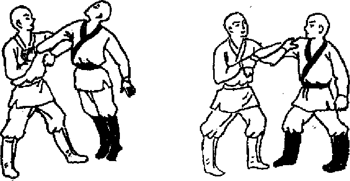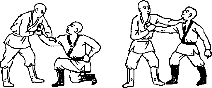 25 托肺蹋裆如乙右手向甲胸部打去,甲可用右手抓住乙右手固定在胸前不放左拳由下向上托乙右肘关节,并用左脚踢乙裆部(图74)